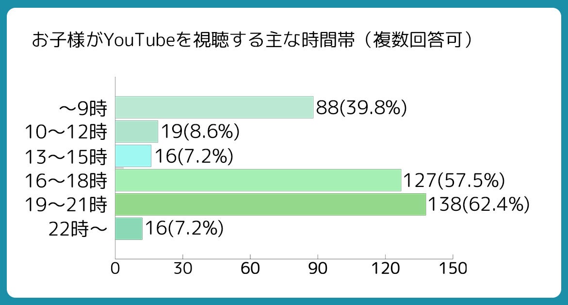 「お子様がYouTubeを視聴する主な時間帯(複数選択可)」に関する質問では、「19時~21時」が138回記録(約62.9%)、次いで「16時~18時」が127回記録(約57.8%)となりました。
