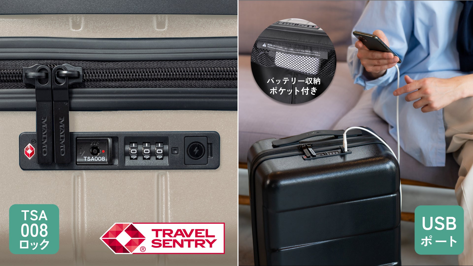 ロックは最新セキュリティのTSA008モデルを採用しています。鍵の必要のないダイヤル暗証番号タイプで、検査官による再施錠漏れを防ぐオートロック機能もあり、ダブルで安心です。また、USBポートも搭載しており、ご自身のモバイルバッテリーを収納することでスーツケース外側から電源を取ることができます。手持ちカバンにバッテリーを入れる必要がないため、これまでよりも身軽にご旅行いただけます。