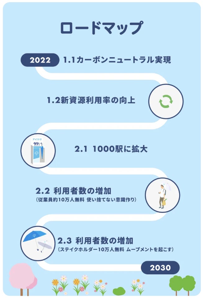 このプロジェクトによりアイカサは、更なる環境面(SDGs12.13)での貢献度を増やし、日本政府も掲げているカーボンニュートラルを傘、傘立てのサプライチェーンにて実現いたします。そして、SDGsの達成期限である2030年までに使い捨て傘ゼロの社会を実現し、いつか令和の子供たちに「昔って、傘を使い捨てていたの?」と言われるような傘をシェアするのが当たり前の世の中を目指します。