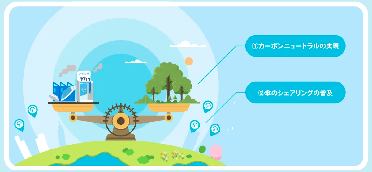 世界でワースト1位となっている日本の傘消費と使い捨て文化を脱却すべく、大手企業が率先して「傘シェア」の認知拡大と利用を促すことで、いつでもどこでもアイカサを借りられる仕組みをより大きく展開することが実現し、行動する人を増やしムーブメントを起こします。