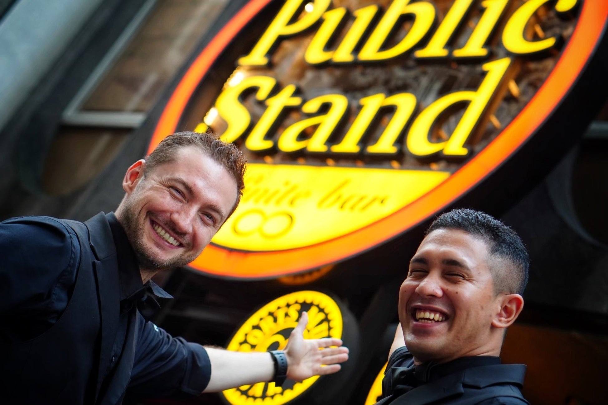 セクションエイトが運営するスタンディングバーで、業界では珍しい「飲み放題」と「出入り自由」 のシステムを採用し、さらに時間に制限を無くすことで誰でも気軽に通え、大学生から社会人まで幅広い年代が多く訪れるパブリック空間を実現しました。プロのデザイナーが監修するゴージャスな内装でカジュアルに会話やゲーム、スポーツ観戦などを時間無制限飲み放題と併せて楽しめます。2017年1月にThe Public stand 恵比寿店を開業し、多くの方のニーズと支持を受け、2022年9月現在では、系列ブランド(シーシャハウス、カラオケハンドレッド)を含む全国22店舗を運営しています。