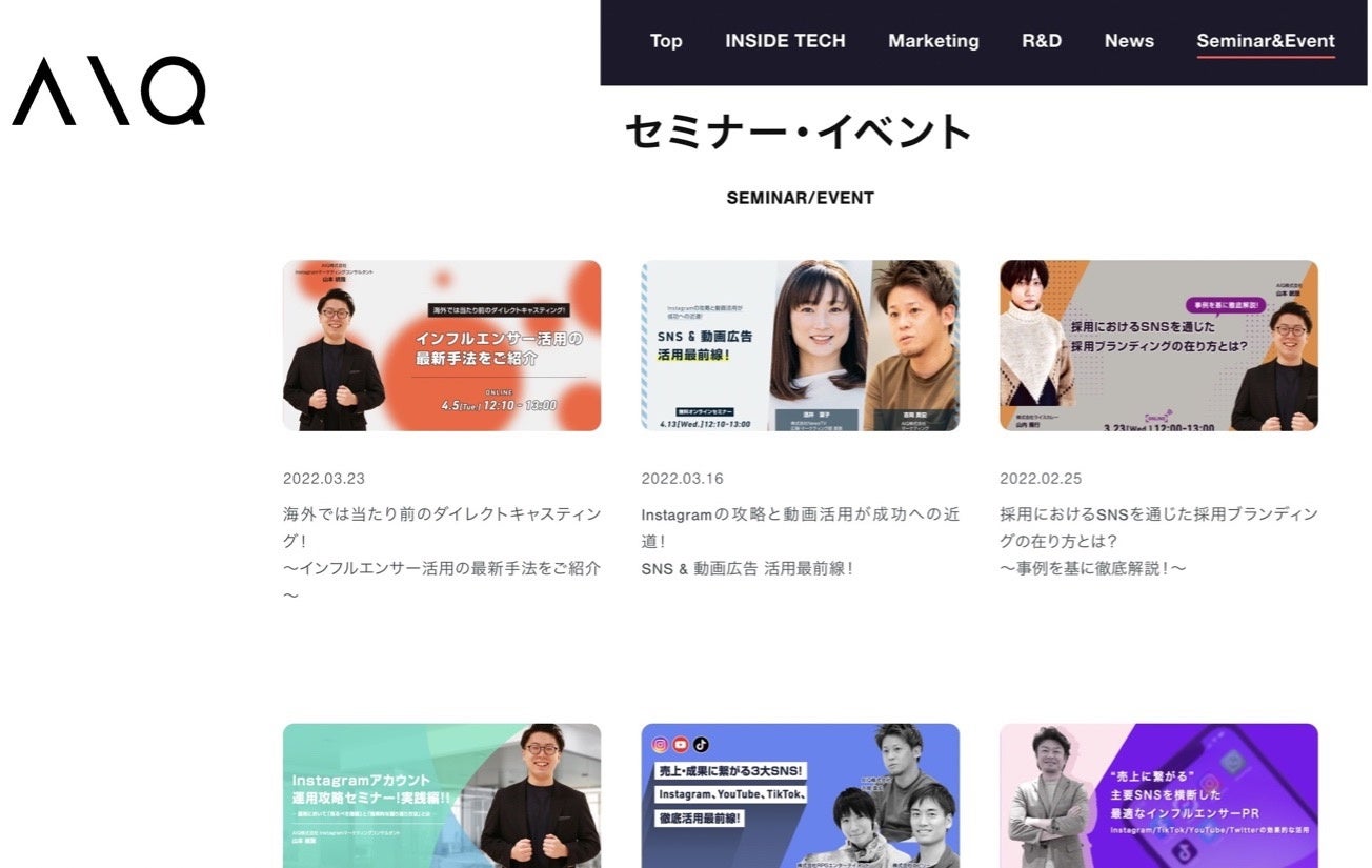 INSIDE TECHで“ヒトのさらなる可能性”を拡張するAIQ(アイキュー)株式会社(本社:東京都新宿区、代表取締役社長 高松睦、以下AIQ)は、独自開発したAI(人工知能)を活用し今話題のSNSマーケティングサービスを提供。Instagramの最適な運用方法や成果の出やすいインフルエンサーの活用方法などざまざまなテーマにてウェビナーを実施しています。