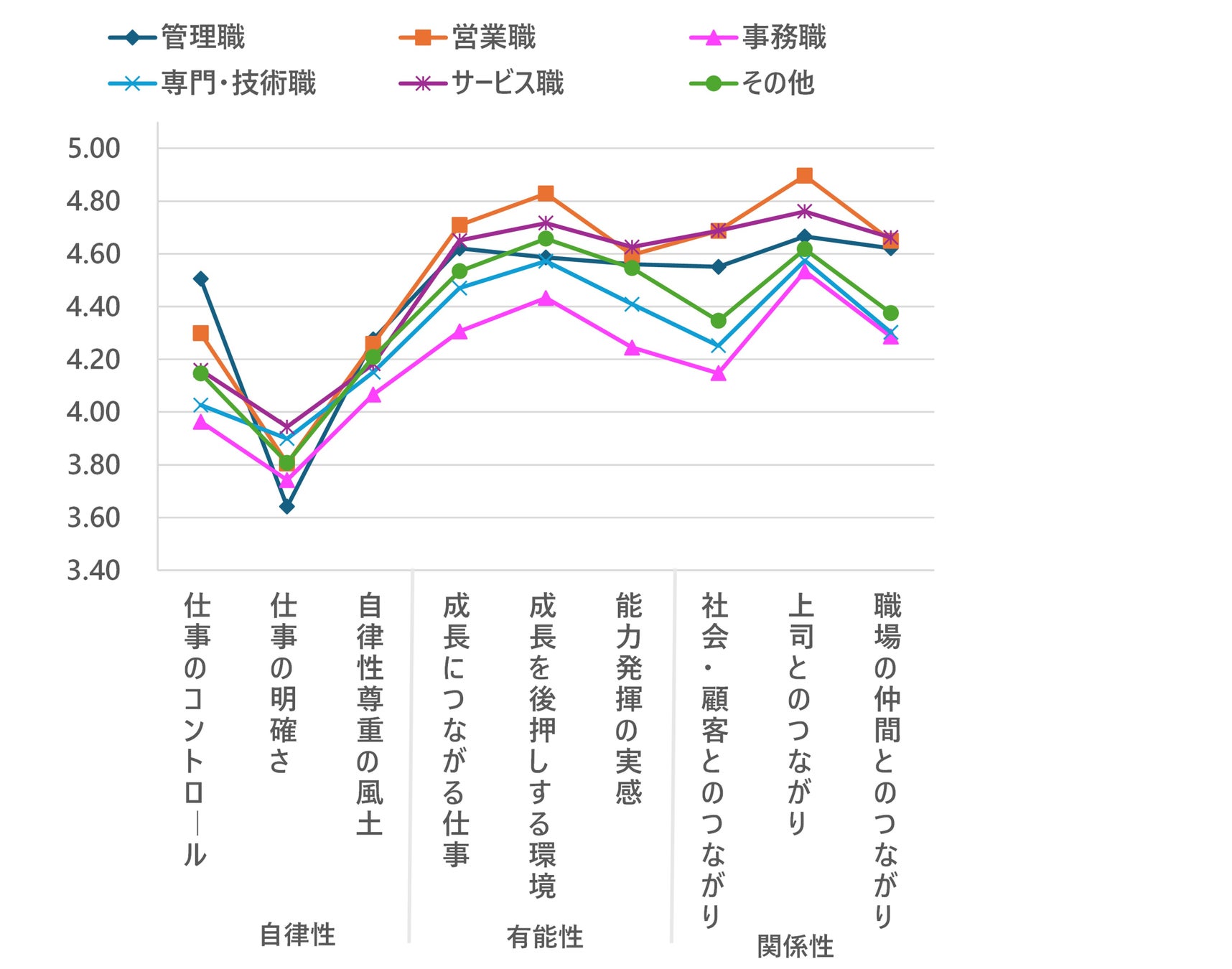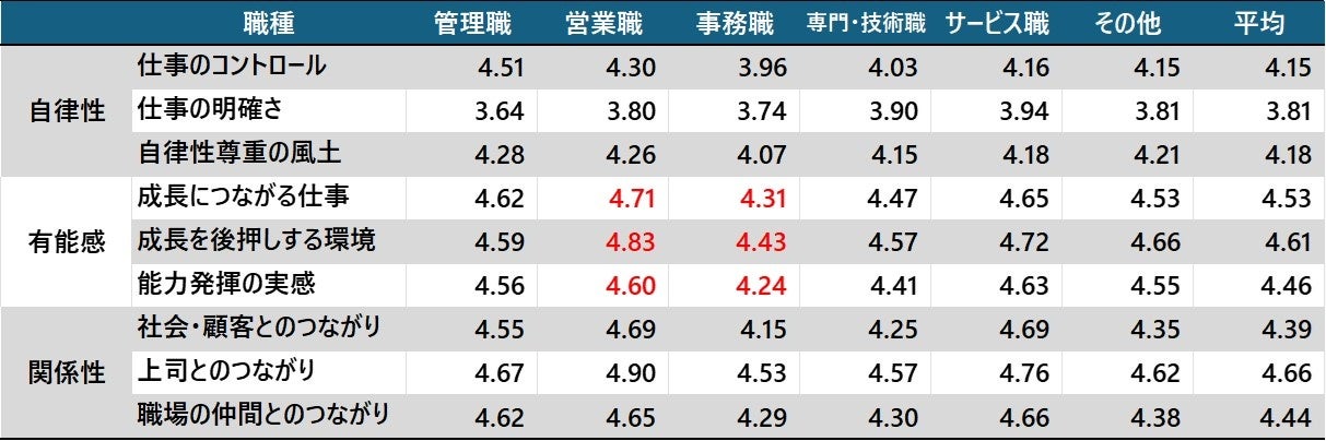 営業職では、有能性の3項目である「成長につながる仕事」「成長を後押しする環境」「能力発揮の実感」の全てで比較的高い値が示され、営業職の方々に対しては、数字的な成果だけでなく、成長につながっていることを伝える場をつくることが必要である。