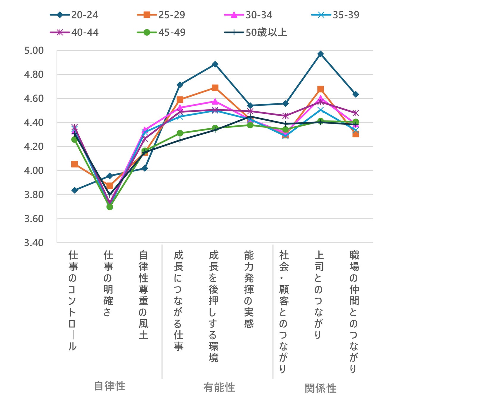 どの指標でも、20代前半が最上位・最下位になっており、意向が明確であることが読み取れる。特に、「仕事をコントロールする」という感覚がないことが影響しているためか、仕事のコントロールの値が顕著に低く、また、「成長を後押しする環境」「上司とのつながり」の意向が強く現れている。20代前半と関わる際は、自己決定感を感じられる環境づくりや、仕事を渡す際には徐々に任せ、仕事を通して成長実感を持ってもらえるような関わりが求められていると言える。