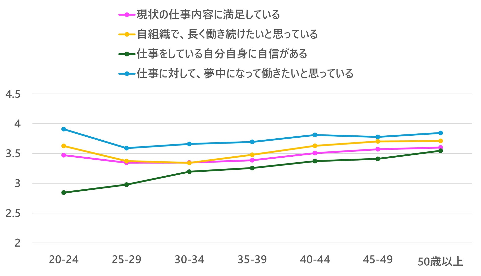 4つの指標を比べると、どの職種でも「仕事に対して、夢中になって働きたいと思っている」が最上位、「仕事をしている自分自身に自信がある」が最下位であることがわかる。
