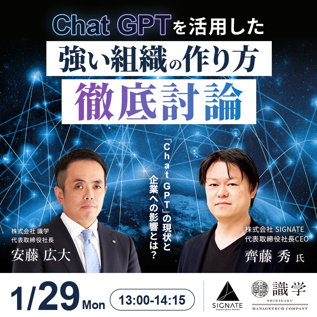 昨今、注目を集めているChatGPTを始めとした生成AIですが、活用が増えてきた一方、疑問や不安から、なかなか積極的な活用に踏み出せない企業も多いのではないでしょうか。会社で活用するイメージができない、AIの回答が本当に正確なのかが分からず振り回されないか不安、情報漏洩などセキュリティ上のリスクは大丈夫なのかわからないなどの声が聞かれます。本セミナーでは、『数値化の鬼』『とにかく仕組み化』著者の識学代表・安藤氏と、累計受講者90,000人超のDX教育サービス「SIGNATE Cloud」を提供するSIGNATE代表・齊藤が登壇し、企業におけるChatGPT活用の可能性と、ChatGPTをはじめとした時代の変化に強い組織を作る方法についてお話しします。