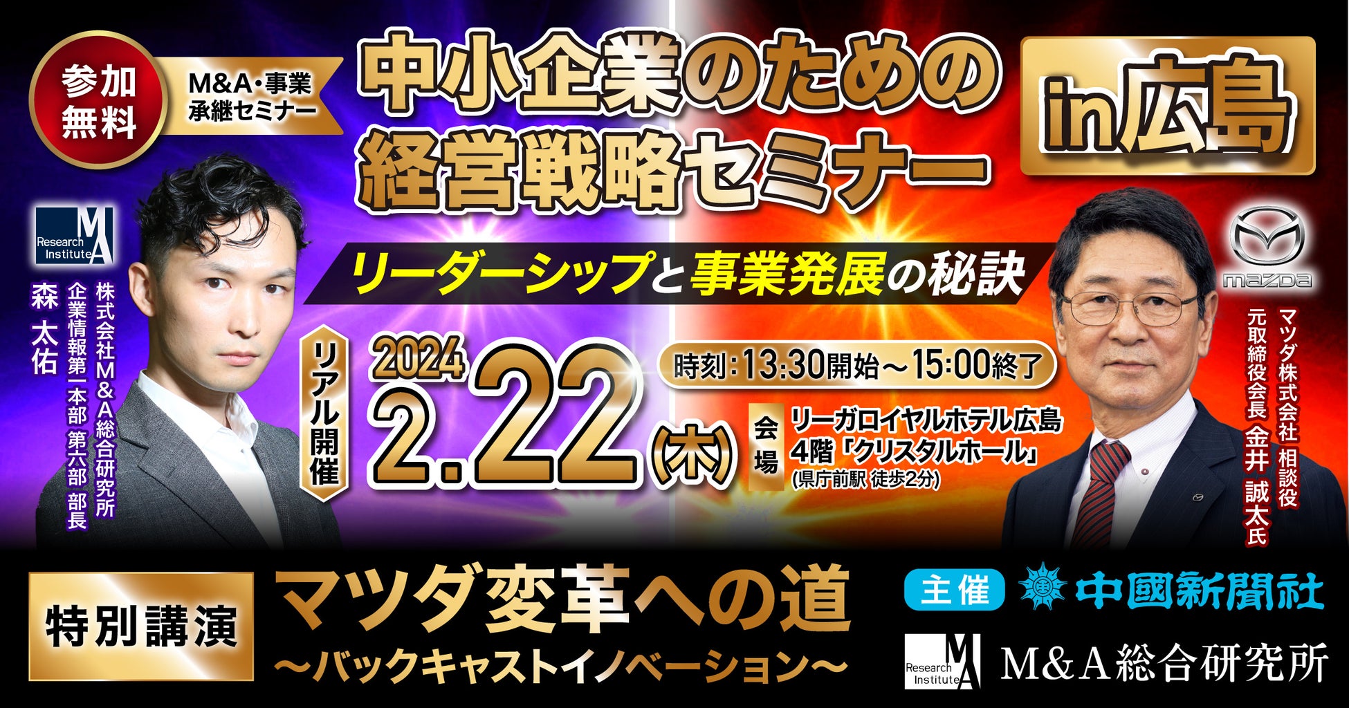 この度、広島県の中小企業の事業承継や成長戦略をテーマに、セミナーを実施させていただく運びとなりました。
