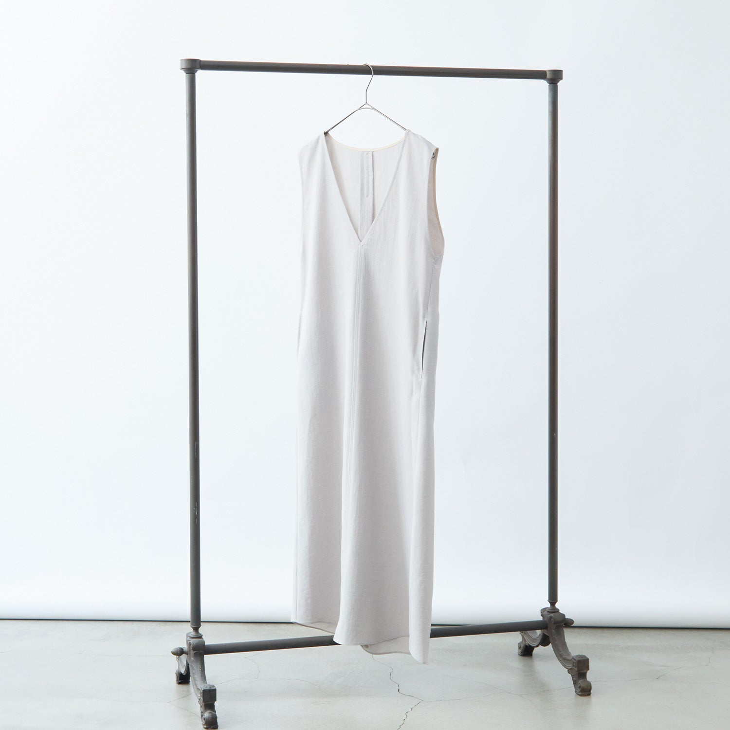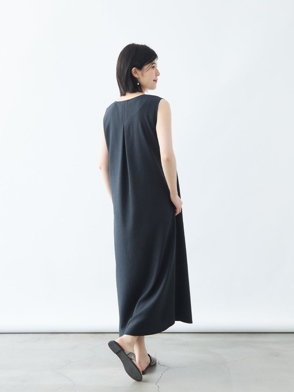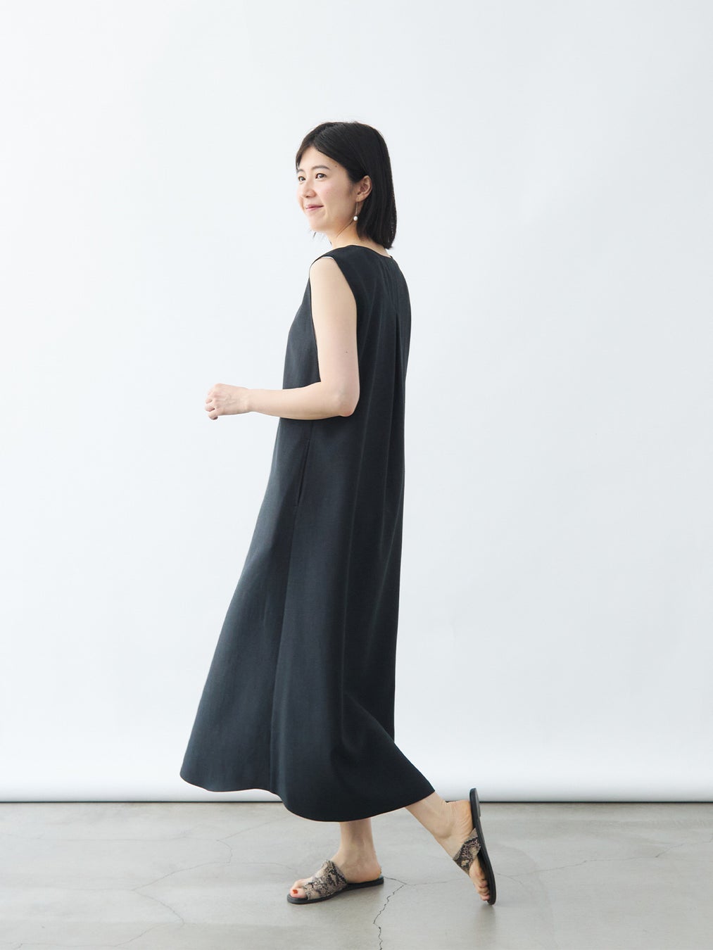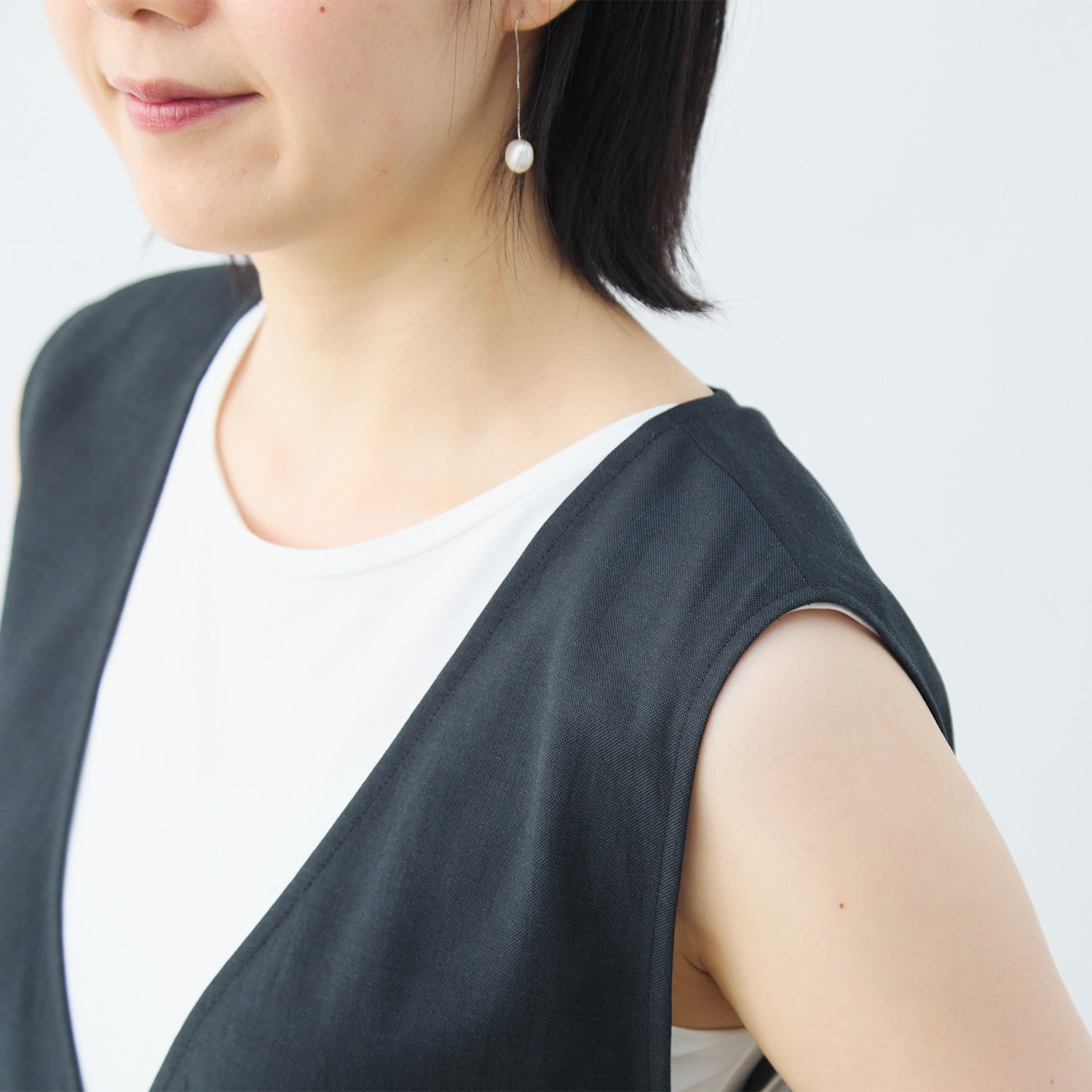 Aラインの特徴を生かしながらよりスマートに細見えしていて、裾にかけてはドレープ感も欲しい、バストラインからウエスト付近までの絞り具合、ウエストからヒップラインのつながり具合、ヒップから裾にかけてのドレープ感とそれを引き出すための丈の長さ等々、最初のサンプル作成から着用を繰り返して3カ月5回の修正を経てできました。