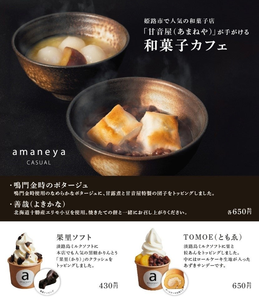 淡路島東海岸の大型商業施設『waSTEP AWAJISHIMA(ワステップ アワジシマ)』内 2024年10月にリニューアルした和菓子カフェ「amaneya CASUAL」が冬メニュー提供開始!!