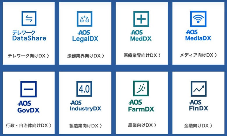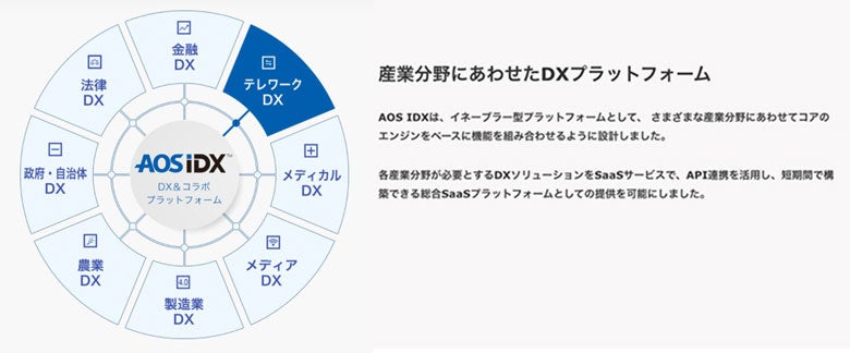 AOS IDX™は、テレワーク向けのDXソリューション「テレワークDataShare」、法務業界向けDXソリューション「AOS LegalDX」、「医療業界向けDXソリューション「AOS MedDX」、メディア向けDXソリューション「AOS MediaDX」、行政・自治体向けDXソリューション「AOS GovDX」、製造業向けDXソリューション「AOS IndustryDX」、農業向けDXソリューション「AOS FarmDX」、金融向けDXソリューション「AOS FinDX」という8つのDX&コラボプラットフォームで構成されます。
