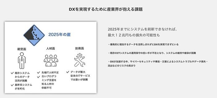 現在、産業界は、ビジネス環境の激しい変化に対応し、データとデジタル技術を活用して、顧客や社会のニーズをもとに、製品やサービス、ビジネスモデルを変革し、競争上の優位を確立するDX(デジタルトランスフォーメーション)の推進が求められています。一方で、真剣にDXに取り組まなければ、レガシーシステムを抱えたまま、多大な損失が発生するリスクが高いという問題も抱えています。