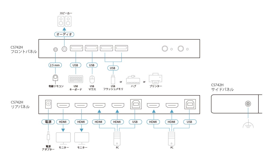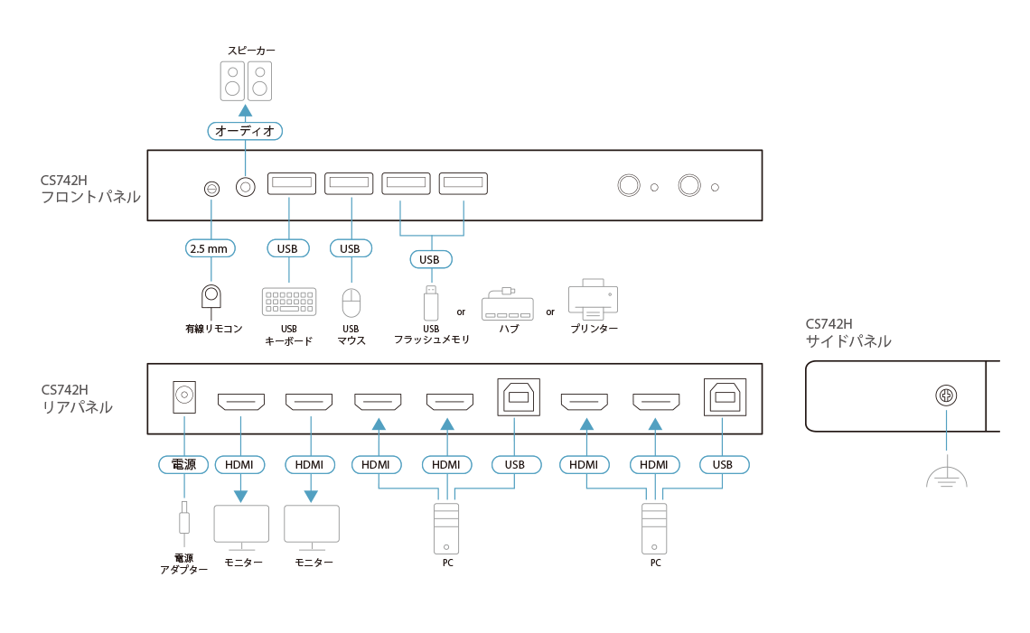 CS742Hは、1組のコンソール(USBキーボード・マウスおよびHDMIディスプレイ)で、2台のPCを切り替えながら操作できる、4K60p対応の2ポートUSB HDMIデュアルディスプレイKVMP™スイッチです。