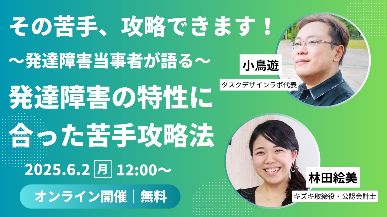 「どうして自分だけ要領が悪いの?」そんな悩みを抱えるあなたへ。発達障害当事者である2人が、自身の特性に合った“苦手の乗り越え方”を語る出版記念イベントを、6月2日(月)に開催します。