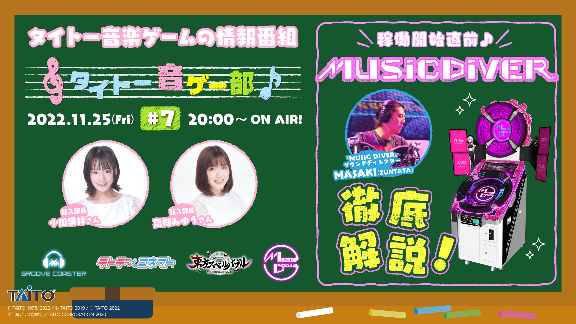 『MUSIC DIVER』の他、タイトーの音楽ゲーム『グルーヴコースター』、『東方スペルバブル』、『テトテコネクト』の合同LIVE配信番組「タイトー音ゲー部」第7回放送となる11月25日(金)の配信では、『MUSIC DIVER』の稼働時点での全容を紹介・解説いたします。「クリエイターズトーク」には『MUSIC DIVER』サウンドディレクターのMASAKI(ZUNTATA)及び開発スタッフが出演。演奏感を感じていただけるゲームとすべく拘り抜いたポイントなどを紹介します。「ゲームプレイ」コーナーでは譜面未公開楽曲を初お披露目!音ゲーファンの知りたい情報をより分かりやすく、詳しくお届けします。