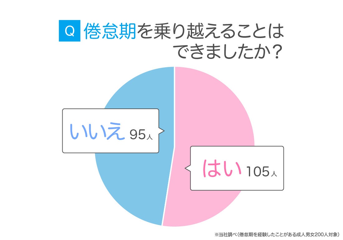 倦怠期を経験したことがある成人男女200人に、倦怠期を乗り越えられたか尋ねたところ、「はい」と回答した人は5割強でした。