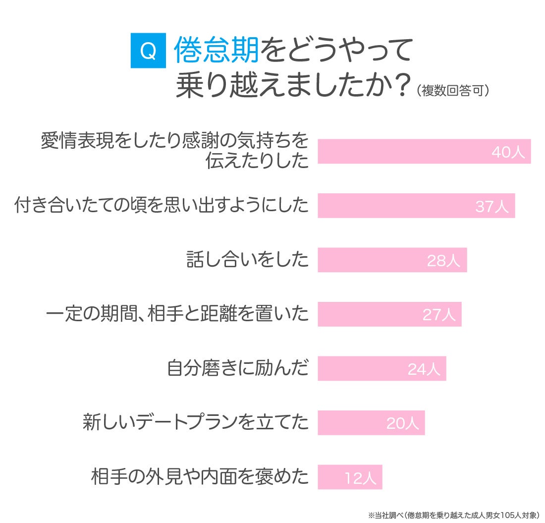 倦怠期を乗り越えたことがある成人男女105人に、どのようにして乗り越えたのか尋ねたところ、最も多い回答は「愛情表現をしたり感謝の気持ちを伝えたりした」でした。