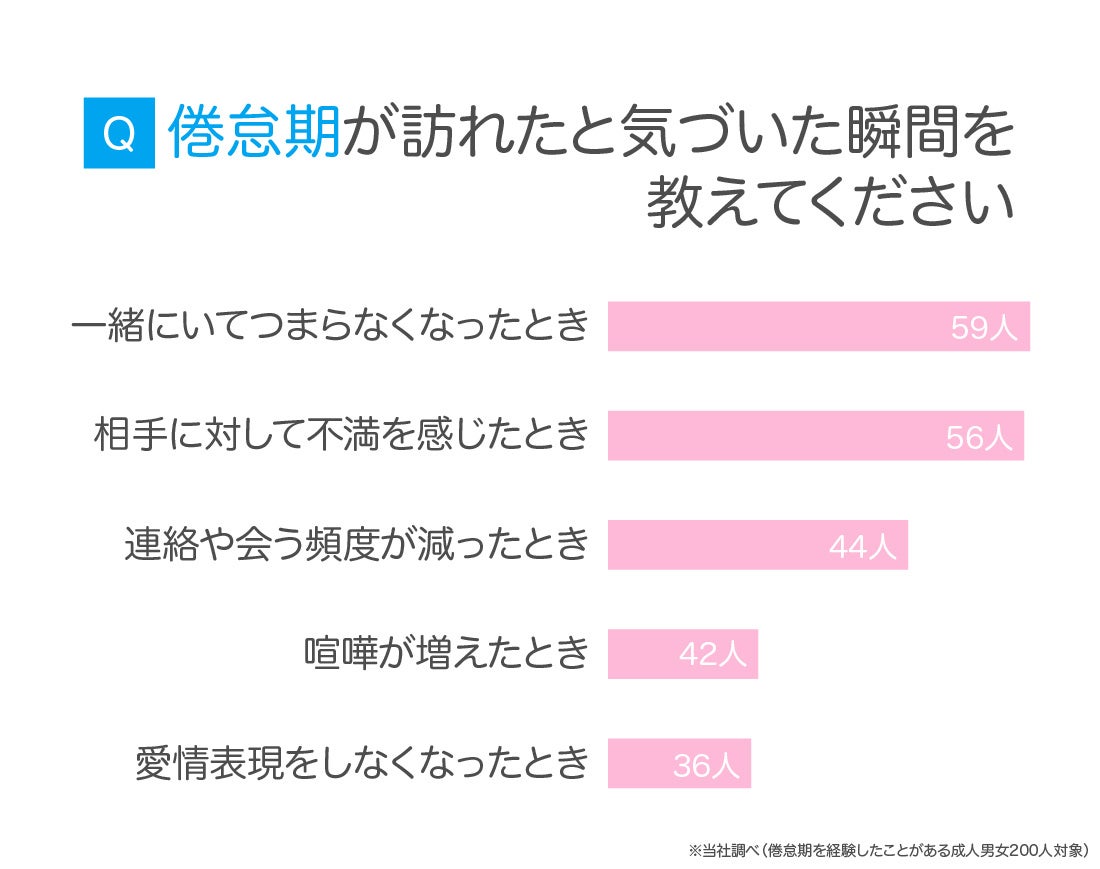 成人男女200人に、倦怠期が訪れたと気づいた瞬間を尋ねたところ、「一緒にいてつまらなくなったとき」が最多回答でした。