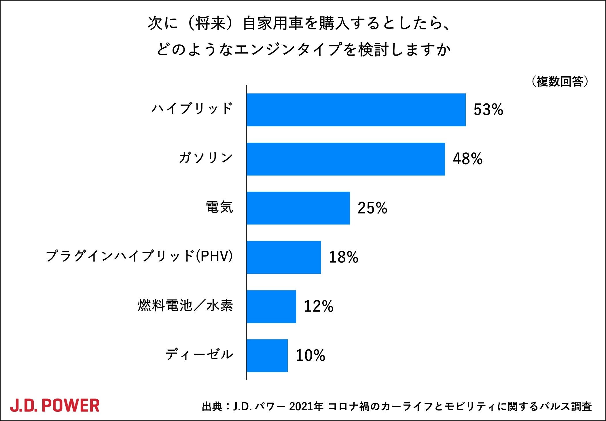 次に購入したいエンジンタイプ、ハイブリットがガソリンを上回る。EVは25%