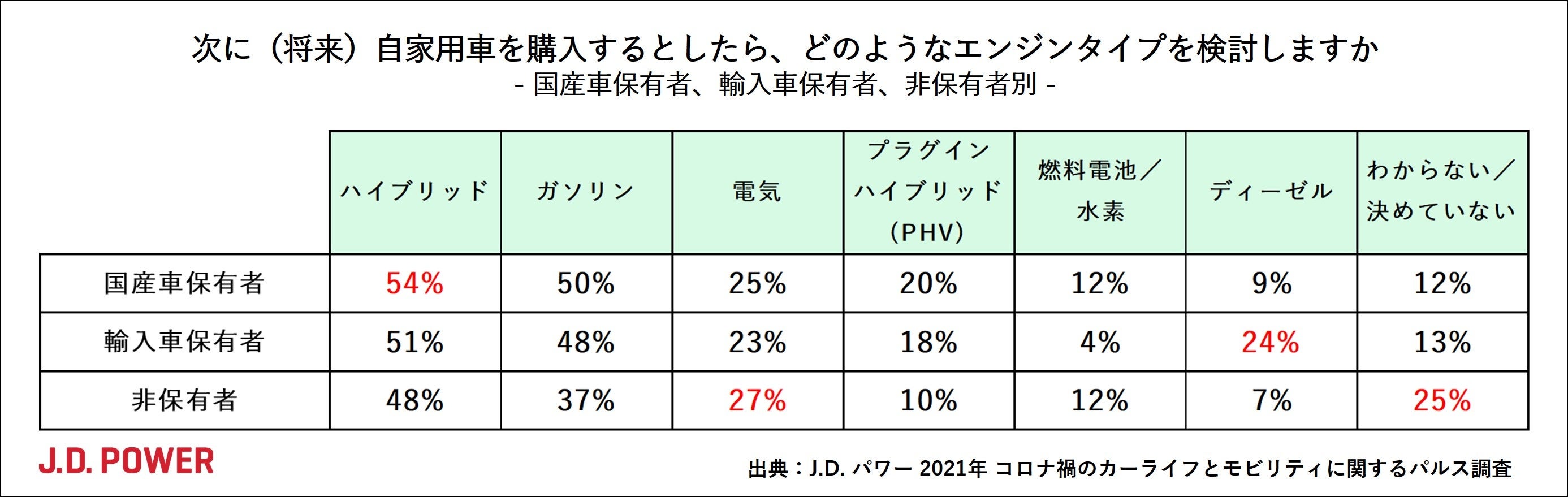 また、これまで車を保有したことのない人や女性は、エンジンタイプの違いや車の機能・性能についての知識や関心が不十分であることが調査結果からもうかがえ、ディーラーによる商談時の説明力はもちろん、実車やITツールなどを効果的に活用した啓蒙活動がますます必要と言えます。
