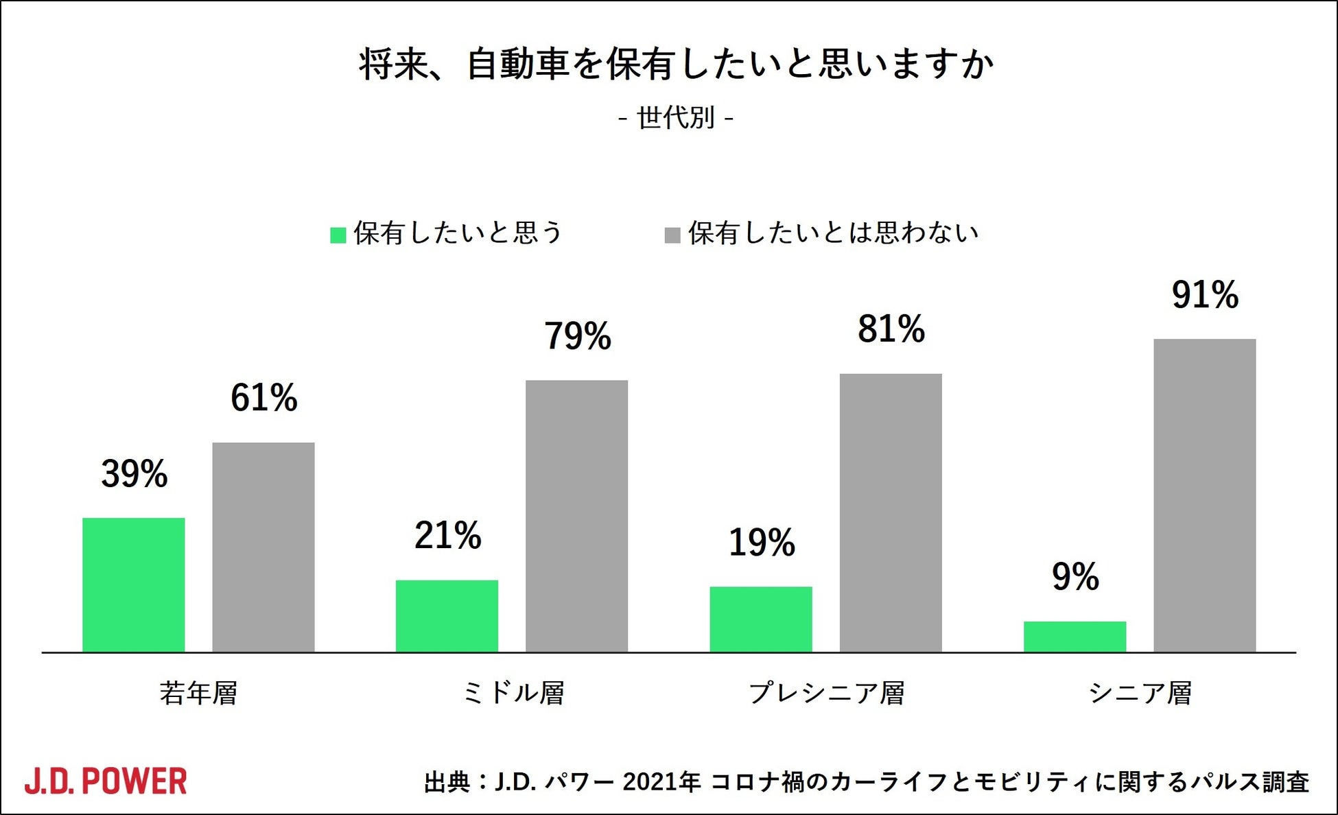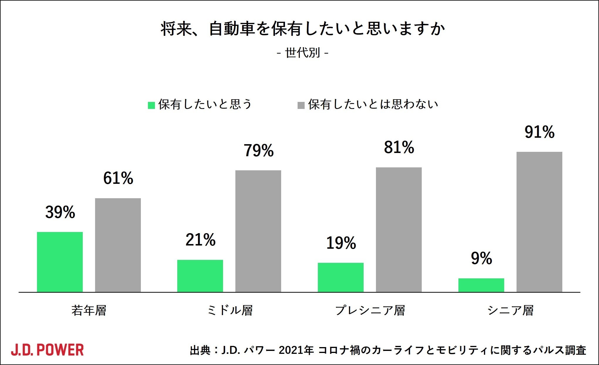 世代別に見ると、「保有したいと思う」割合は若年層が最も高く、39%という結果になりました。車離れが進んでいると言われる若年層ですが、約4割が自家用車保有に積極的な考え方であることが確認できました。