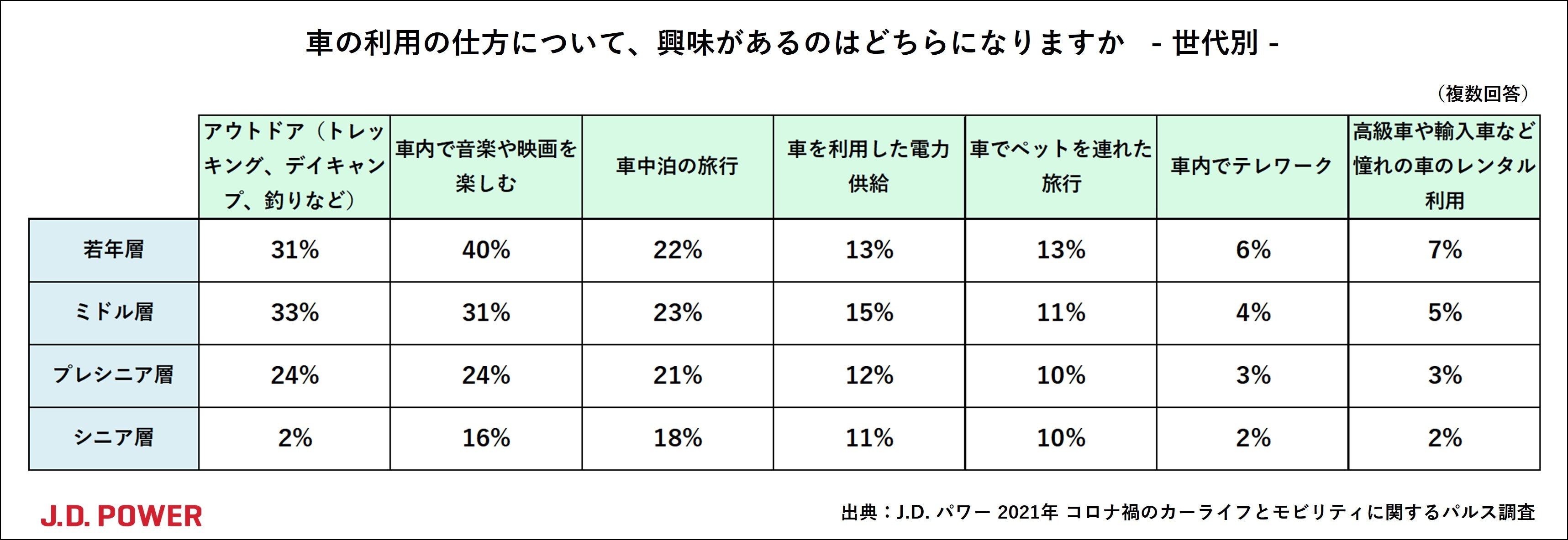 移動ツールプラスαの利用目的についても、アウトドアや車中泊旅行といった新しい旅のスタイル、車内での音楽・映画鑑賞といったプライベート空間の利用などに、年代を問わず関心があることがわかりました。