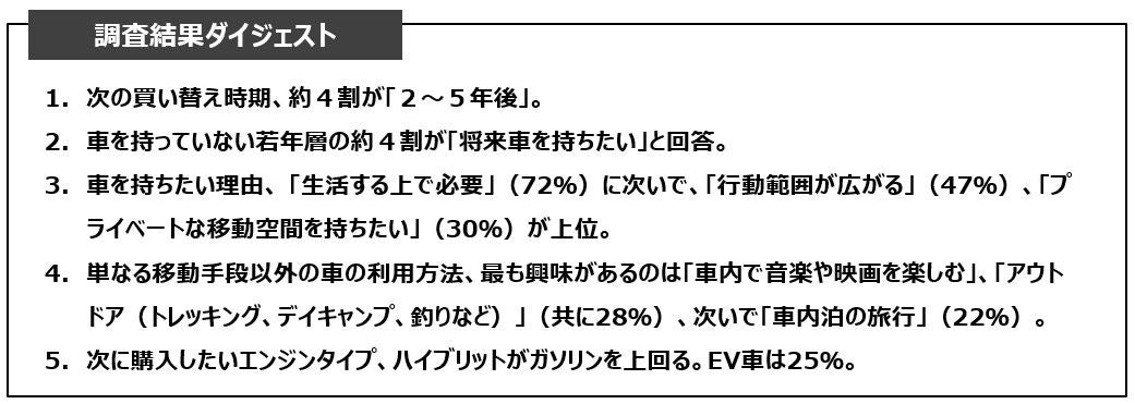 レンタカーやカーシェアなど車を保有しない新しいカーライフの楽しみ方が広がりつつありますが、依然マイカーを持つことに価値を感じる人が一定数いることが確認できました。一般的に車が生活する上で不可欠ではない都市部に住む層や若い世代を取り込む為には、車の魅力や利便性はもちろん、マイカー保有がもたらす醍醐味や悦び、行動範囲の拡大といった側面を改めて訴求する取り組みが大事だと言えそうです。