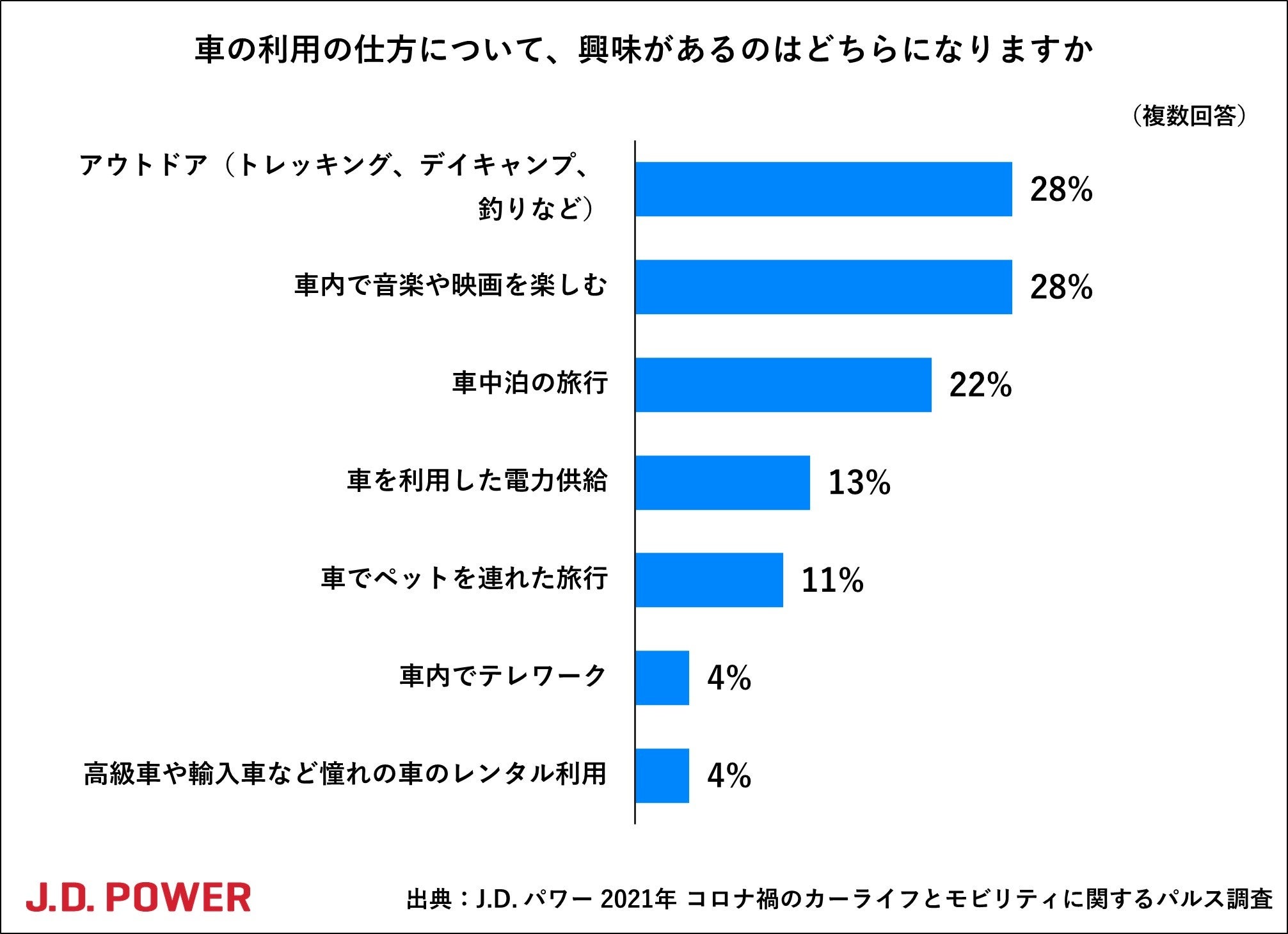 回答が多かった順に、「アウトドア(トレッキング、デイキャンプ、釣りなど)」、 「車内で音楽や映画を楽しむ」 (共に28%)、「車中泊の旅行」(22%)、「車を利用した電力供給」(13%)、「ぺット連れの旅行」(11%)という順になりました。
