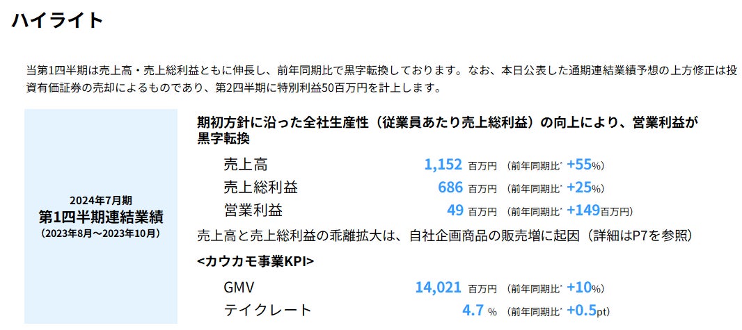 (注)2023年7月期以前は連結会計を行なっていないため、前年比較においては単体会計の数値を参照しています。