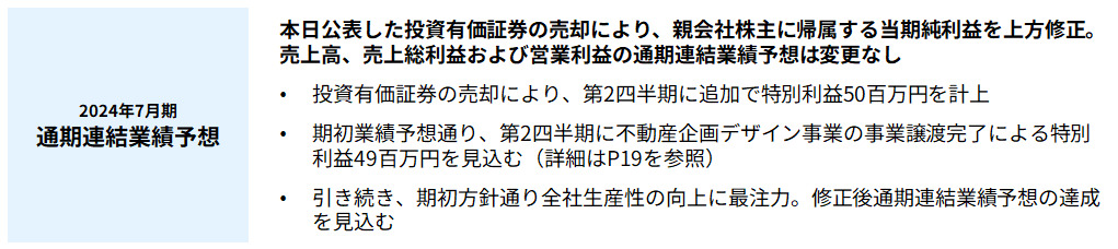第2四半期においては、以下二点により特別利益が計99百万円発生する見込みです。一点目は、前述の投資有価証券売却により、特別利益50百万円を計上します。二点目は、不動産企画デザイン事業の事業譲渡完了により、特別利益49百万円を見込みます。こちらは期初業績予想に織り込まれております。