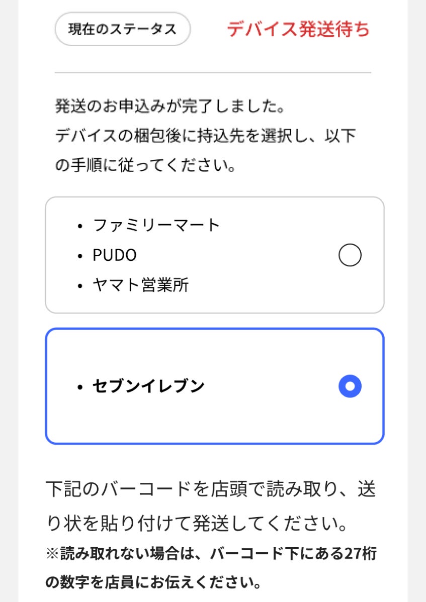 「にこスマ買取」でセブン-イレブンの持込配送を利用する場合、申込み画面で「持込配送」を選び、「セブンイレブン」を選択します。梱包したスマートフォンやタブレットを店舗に持ち込み、画面に表示されたバーコードを店頭で読み取ることで発送が完了します。