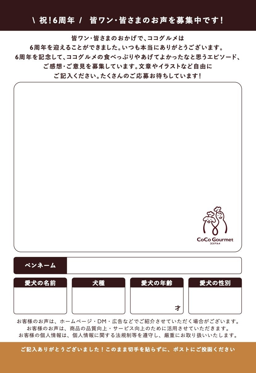 ココグルメへのご感想、ご意見はもちろん、食べっぷりやあげてよかったなと思うエピソードを、文章やイラストなどで自由に書いていただけるよう、手書き用のハガキを定期便に同封します。