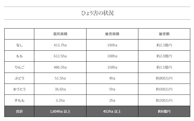 令和4年6月3日、福島市内の一部地域に雹(ひょう)が降り収穫を控えるくだもの(モモ、ナシ、ブドウ、リンゴなど)に雹(ひょう)が当たり、 傷がつくなどの被害がありました。被害総額は約6億円に上ります。