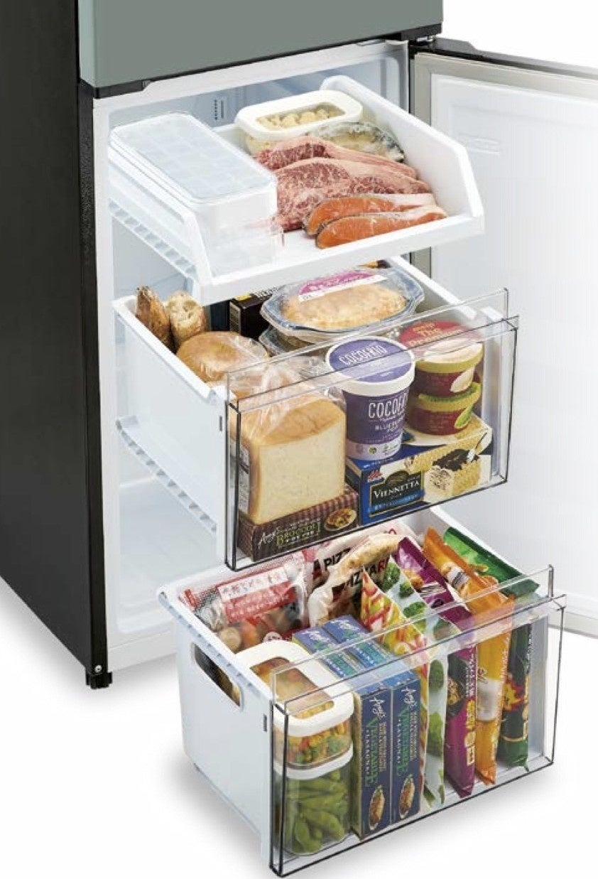 もちろん、色だけでなく、機能や使い勝手にもこだわりました。忙しい日々をしっかり支えるクラスNo.1(※1)サイズの大容量冷凍室は、3段の引き出しタイプで、まとめ買いした冷凍食品や作り置き料理の整理も簡単。インバーターコンプレッサーを搭載した省エネ設計で、家計にもやさしい仕様です。