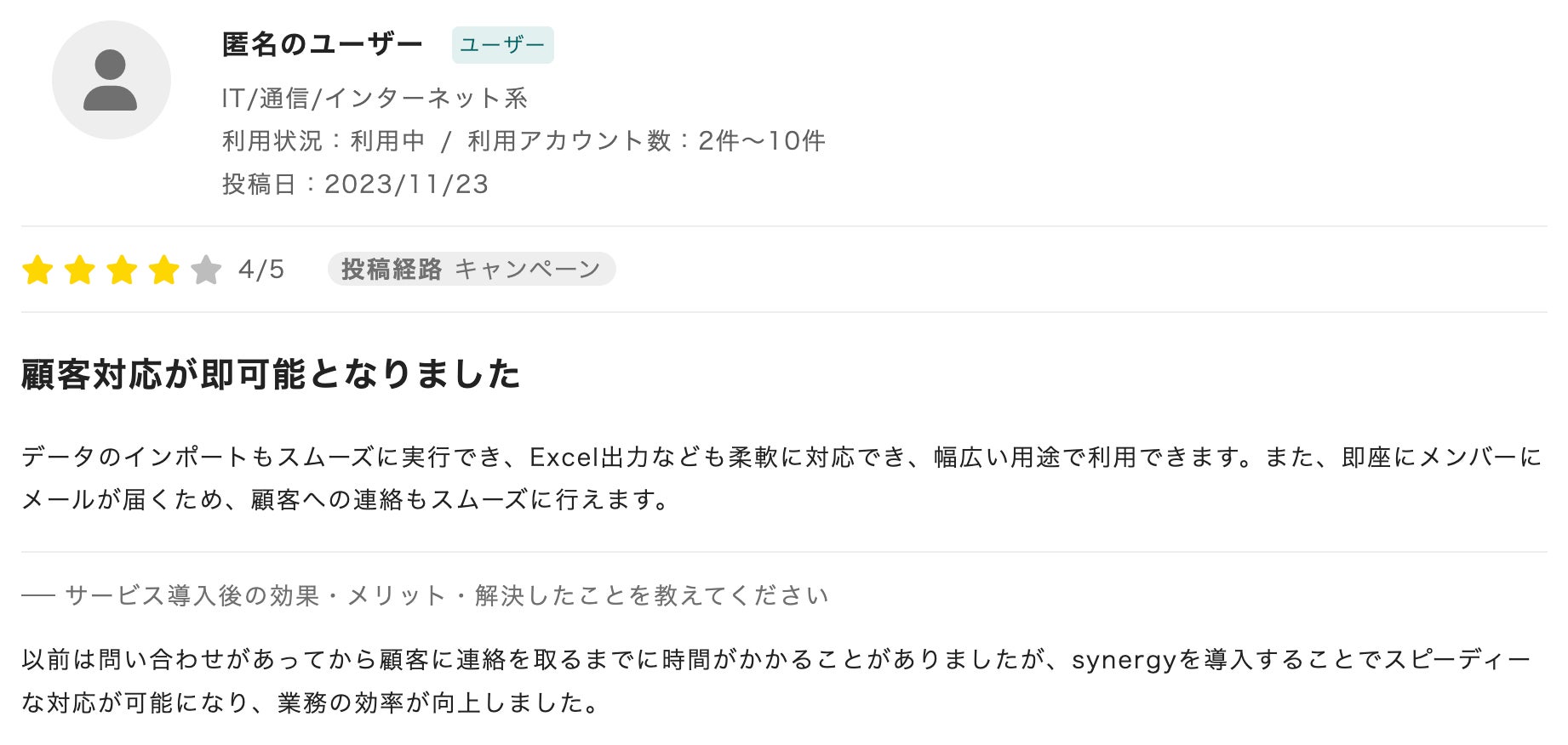 Synergy!は、顧客管理データベースを軸にWebフォームの作成、多様な条件設定が可能なメール配信機能などを備えた国産クラウド型のCRMシステムです。2022年にはインフラ基盤をアマゾンウェブサービス(AWS)へ移行しモダナイゼーションを完了、サービスの進化に追従できる拡張性の高い基盤を構築しています。必要な機能と使いやすさにこだわった管理画面と万全のサポート体制で、ITreview カテゴリーレポートにおいても「ユーザー管理機能No.1」(※2)、「サポート品質No.1」(※3)に選ばれ、現在までに約3,000社(※4)への導入実績があります。
