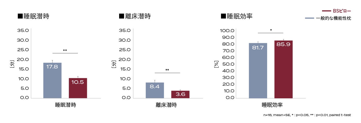 寝つきの良さを示す指標である睡眠潜時<就床から入眠までに要した時間>は、一般的な機能性枕の17.8±1.9分に比べて、ブレインスリープ ピローでは10.5±1.2分と有意に減少しました。また、目覚めの良さを示す指標である離床潜時<最終覚醒から起床までの時間>についても、一般的な機能性枕の8.4±0.9分に比べて、ブレインスリープ ピローでは3.6±0.5分と有意に減少しました。また、睡眠潜時と離床潜時が短縮したことに起因して、睡眠効率<ベッドにいた時間のうち実際に眠っていた時間の割合>も、一般的な機能性枕の81.7±2.3%に比べて、ブレインスリープ ピローでは85.9±1.9%と有意に改善しました。