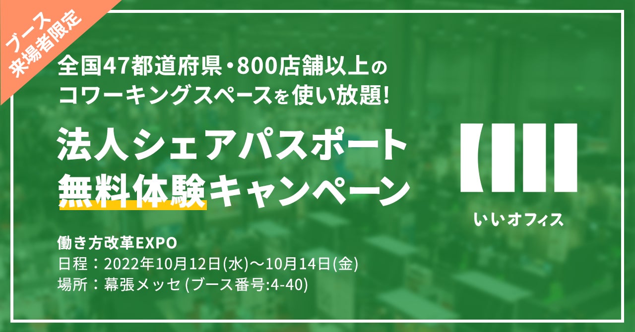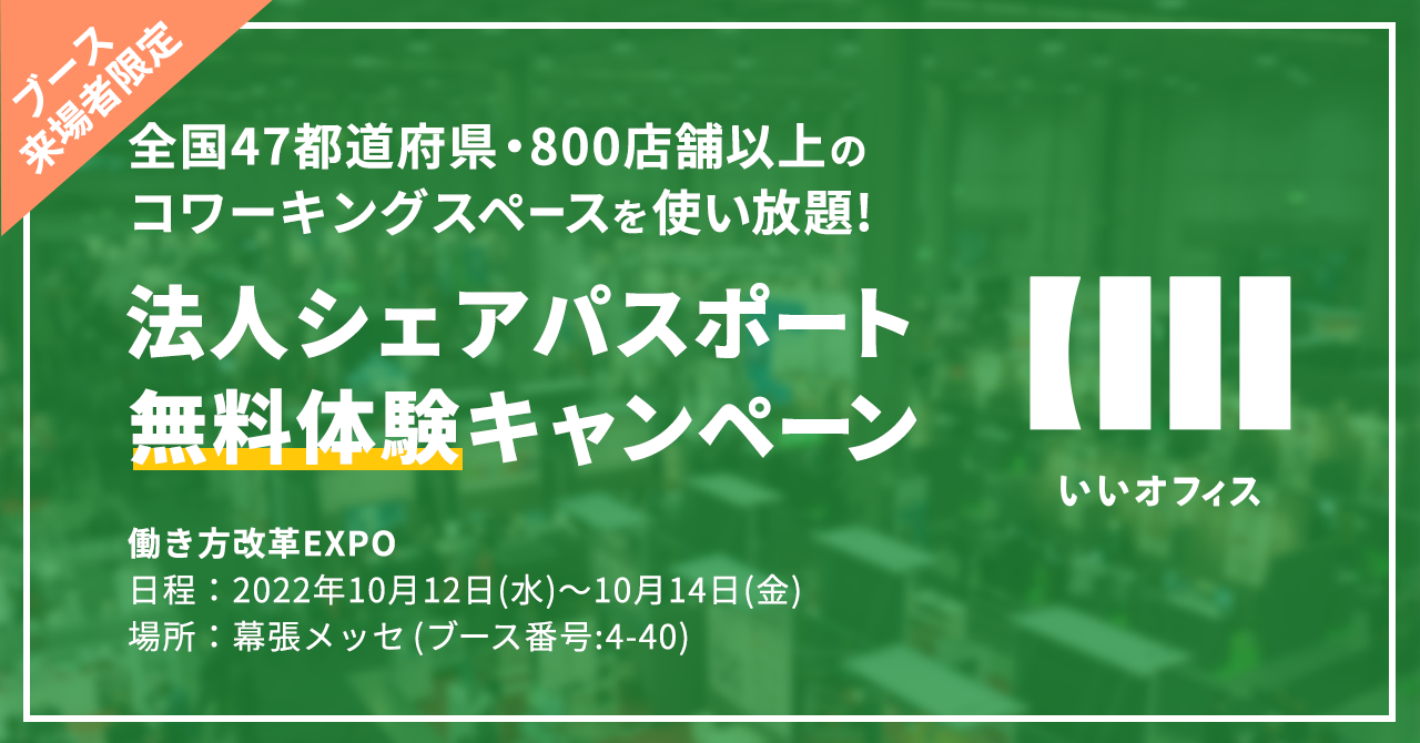 来場するだけで全国800店舗以上のコワーキングスペースが使いたい放題⁉いいオフィスが「働き方改革EXPO」来訪者限定で法人プラン無料体験を期間限定でご提供