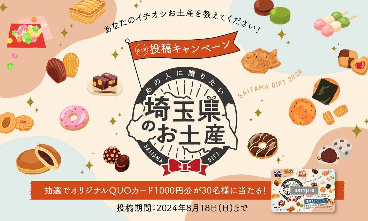 一般社団法人埼玉県物産観光協会(会長:朝霧重治)は、「あの人に贈りたい埼玉県のお土産」をテーマに、埼玉県のお土産に関する投票を軸とした一般参加型プロモーション「埼玉県お土産プロジェクト」を本日より開始することといたしましたのでお知らせいたします。