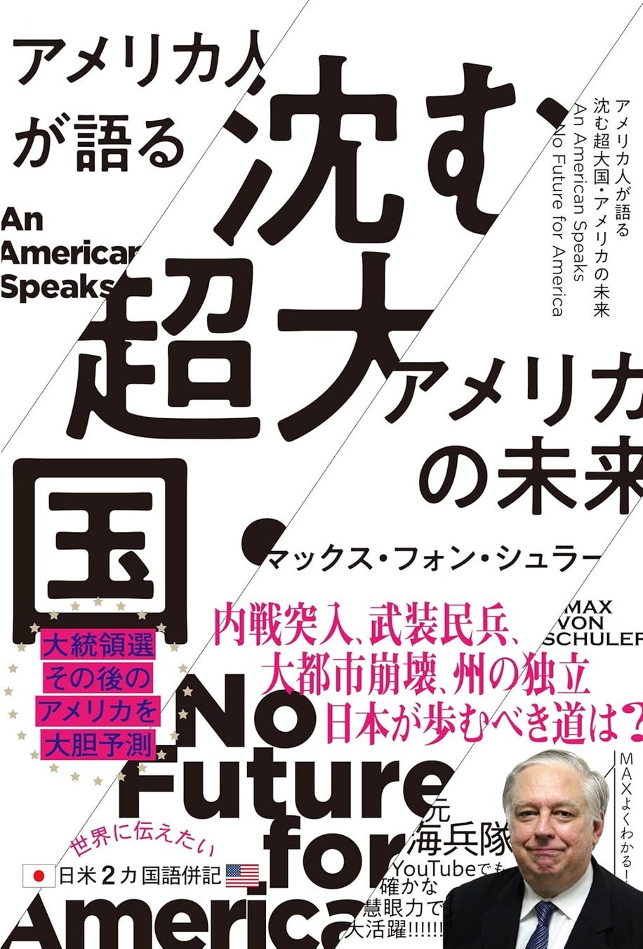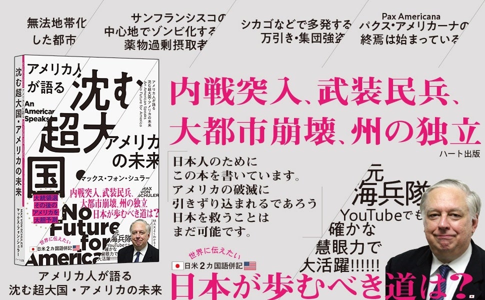 米海兵隊員として来日してから49年、日本の文化に親しみ、日本人を愛し、それ故に日本人の自虐史観に我慢ができず、日本人に代わり常に日本の立場で発信、活動を続けてきたマックス・フォン・シュラー氏。現在は、主にYoutubeなどのSNSにて「アメリカの悲惨な現状」についての情報を発信しており大反響を呼んでいます。そんな著者の最新刊である本書は、民主党政権の極端な政策によって崩壊していくアメリカの姿をリアルに描写する一方で、アメリカの未来を決める「2024大統領選」までの約1年にわたるドキュメントを詳述、その上で「日本は、日本人はどうするべきか」という指針を示します。