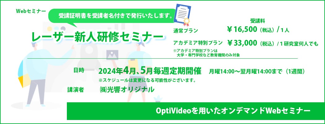 光業界に関わるあらゆる方(研究者・候補者(学生)の方、企業の新入社員の方、その指導員等)を対象に、4月、5月はレーザー新人研修セミナーをオンデマンドで定期開催致します。当セミナーは、弊社レーザー・光学専門のサブスク動画学習サービス「OptiVideo」を利用し、光学の基本となる知識を厳選したレーザーの講義内容となります。また、従来の主に静止画の説明でわかりにくかったセミナーから、基本的に動画(アニメーション)でわかりやすく解説をしており、高評価をいただいております。この機会にぜひレーザー新人研修セミナーにお申込みください。