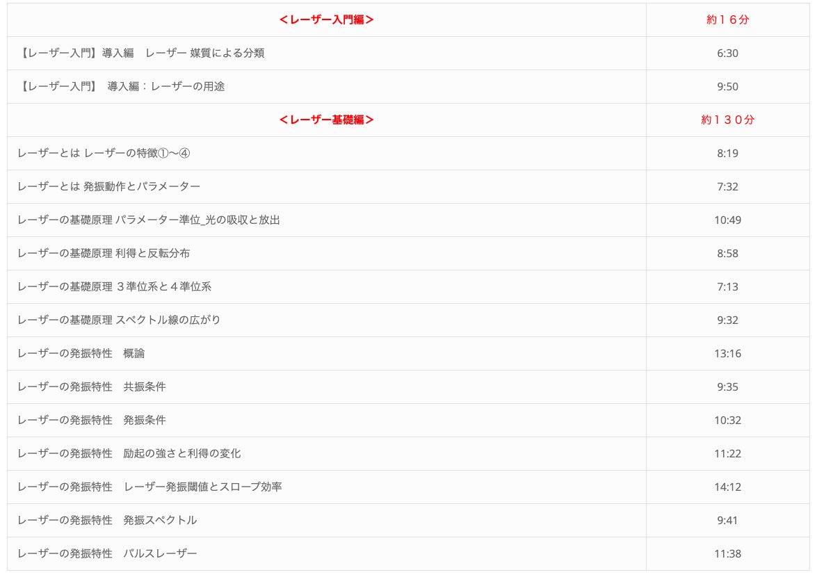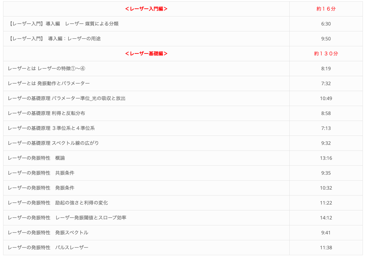 弊社レーザー・光学専門のサブスク動画学習サービス「OptiVideo」をご利用いただく、レーザーに新しく関わる皆様に向けた基本となる知識についての動画学習となります。レーザー基礎をご紹介する下記10を超える動画を準備いたしました。各動画は10−20分で、全動画再生時間は約140分(2倍速で約70分)となります。