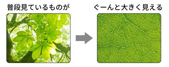 4段階倍率調節+2段階焦点調節によって、観察対象を数十倍から最大800倍まで総合拡大可能。普段とは全く違う超微細な世界を観察し、新しい発見がさらに実感できます!