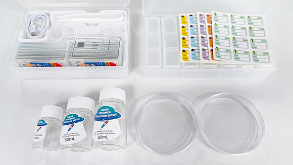 スポイト、スライドガラス、シャーレやサンプルボックスなど様々な器具が付属!