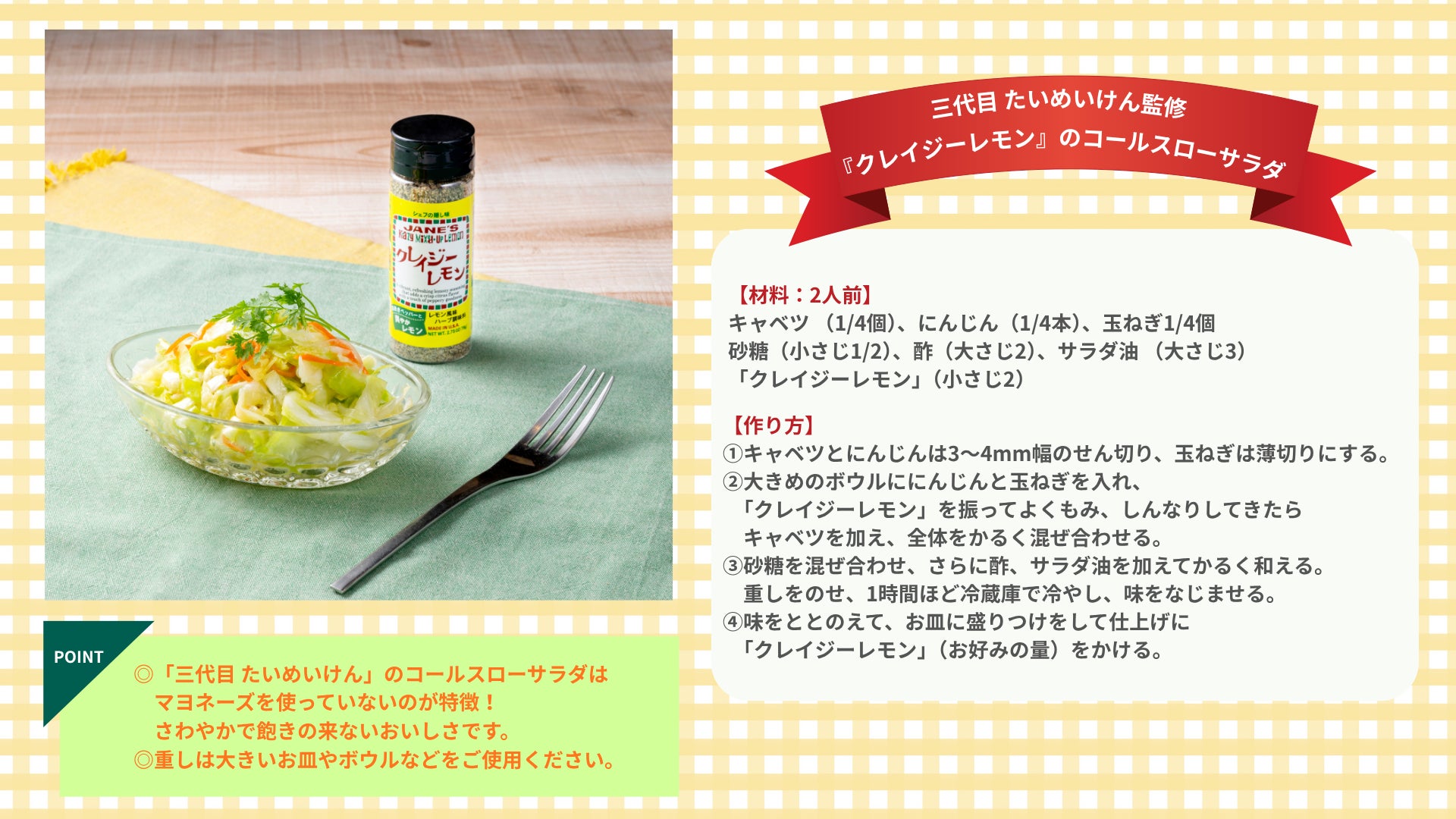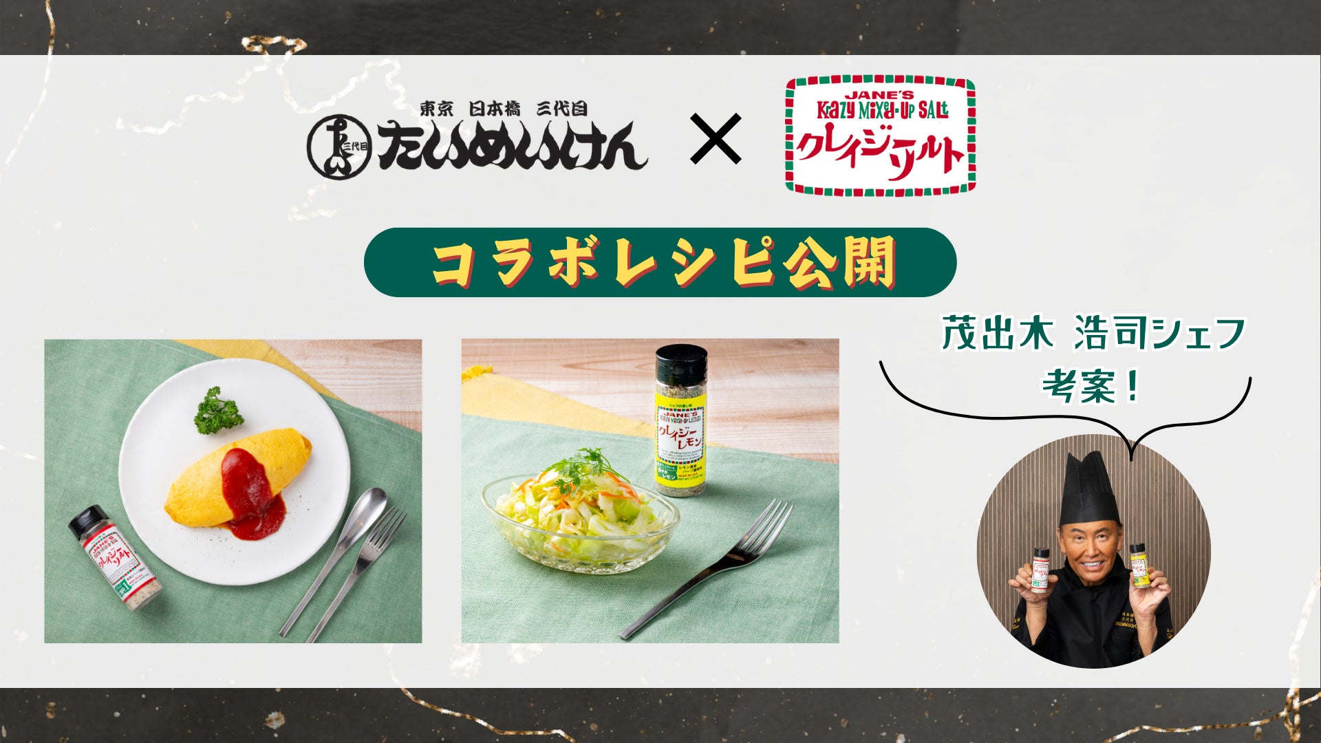 今回のコラボでは『クレイジーソルト』『クレイジーレモン』を使い、「三代目 たいめいけん」看板メニューであるオムライスと、人気サイドメニューのコールスローサラダのレシピを開発。「三代目 たいめいけん」の茂出木 浩司シェフが『クレイジーソルト』を以前からご愛用されているというお話からコラボレシピの協同開発に至りました。