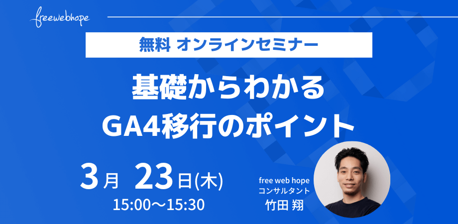 株式会社free web hope(本社:東京都中央区、代表取締役:相原ゆうき)は、無料のオンラインセミナー「基礎からわかる Googleアナリティクス移行のポイント」を3月23日(木)に開催いたします(https://share.hsforms.com/1MRw8VvLMR9yVFkldZ8JIcA5fwo5)。