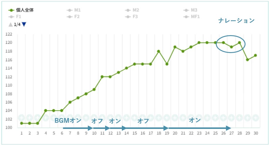 【6秒目~13秒目】BGMのオン・オフ⇒6秒目に風の吹く音が挿入。9秒目にはオフになり、バスのアナウンスが挿入。13秒目に一瞬だが再びBGMがオンに。中盤にかけて様々なサウンドエフェクトを挿入することで聴覚に刺激を与えることができたからか、注視は右肩上がりで増加。