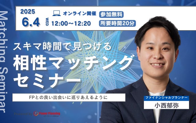 6月4日(水)12時よりスキマ時間を活用して自分に合ったFPを探すことができる、小西郁弥講師との「相性マッチングセミナー(無料)」を開催いたします。