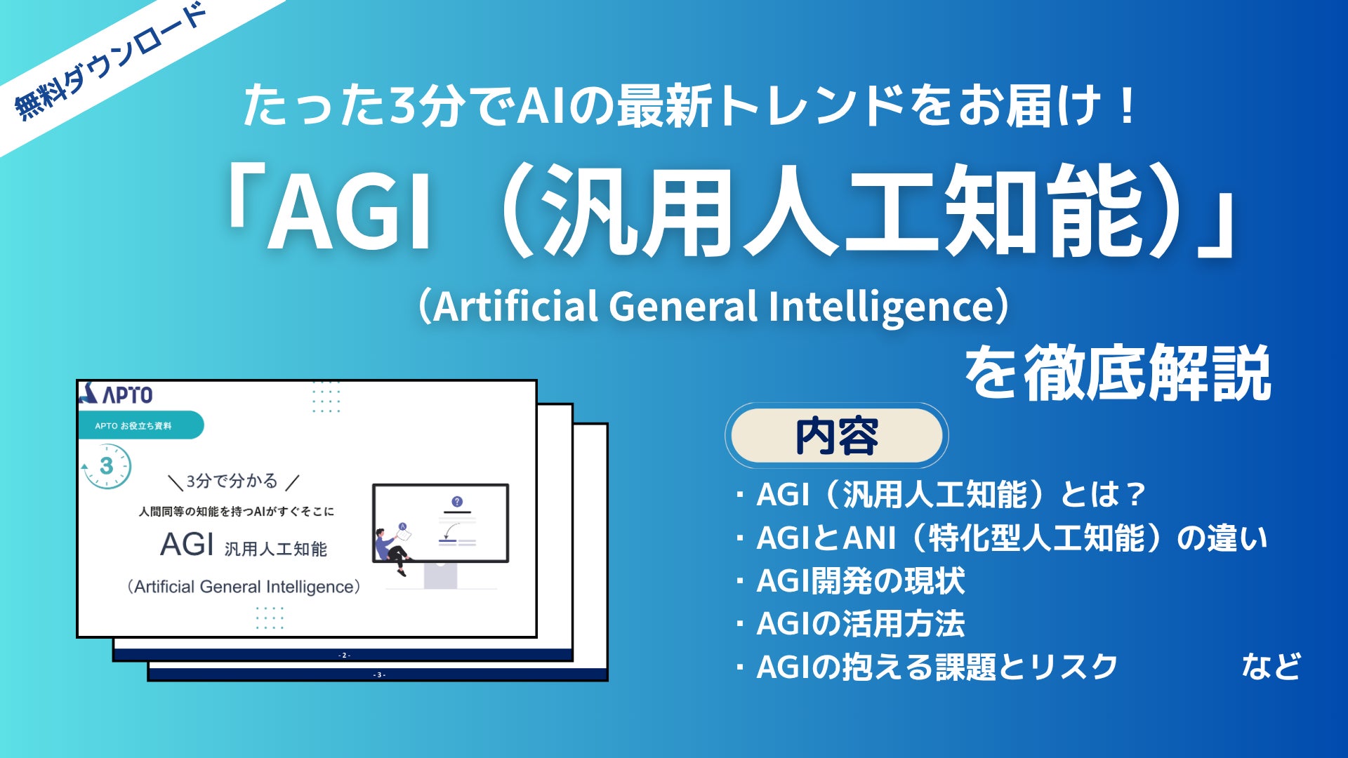 株式会社APTO(本社:東京都、代表取締役:高品良)は、「AGI(汎用人工知能)」に関する資料を無料で公開いたしました。