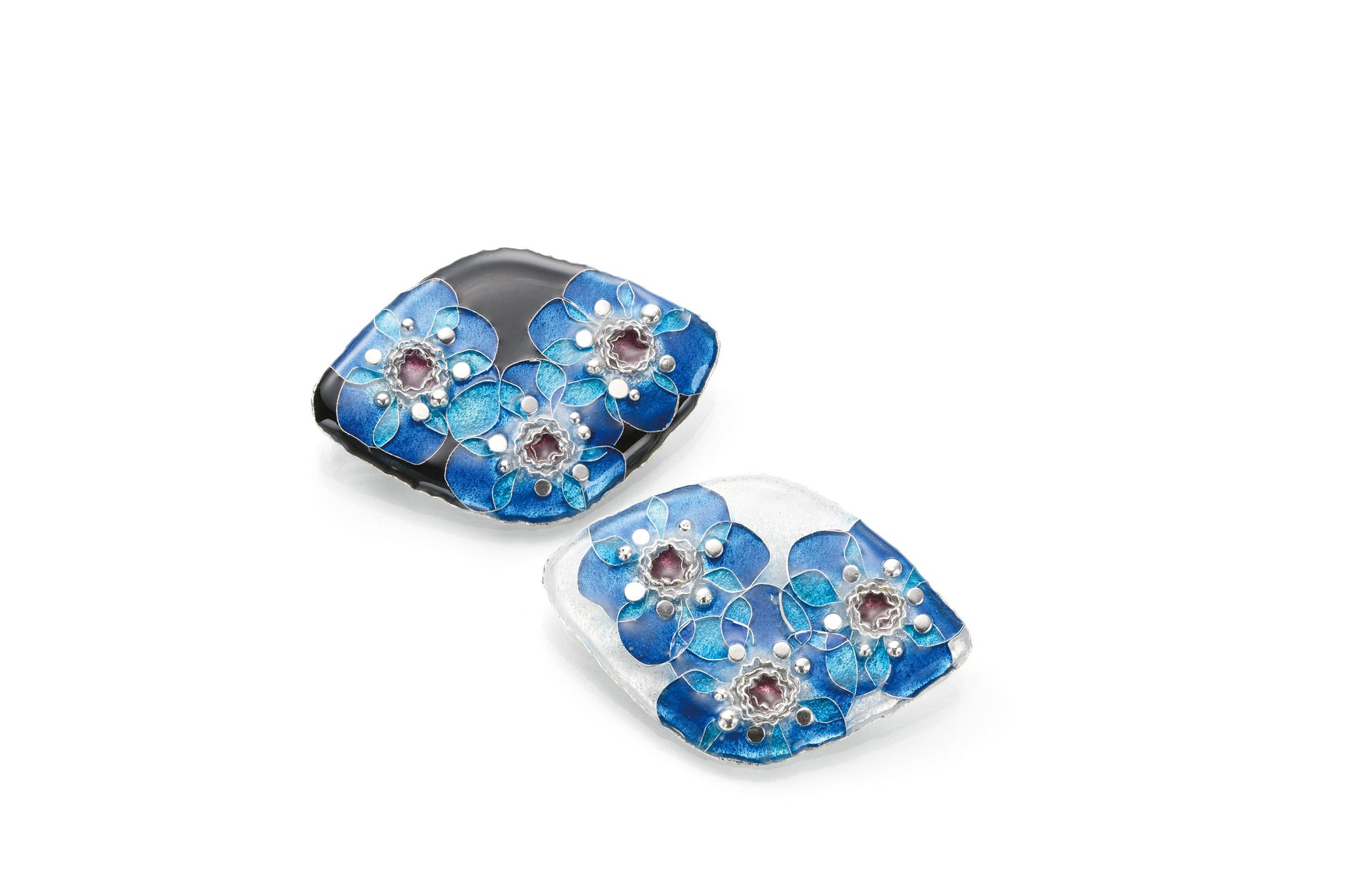 京都嵐山で伝統工芸の一つ、京七宝を製造・販売する工房、「ヒロミ・アート」。現代風にアレンジされたデザインと純銀を使用した華やかな色彩のブローチ。初夏にぴったりのみずみずしいブルーです。