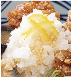 にんにく醤油味のジューシーな鶏ももから揚げは、鬼おろしと特製ぽん酢とも相性抜群。なすの揚げ浸しと刻み柚子が夏らしさを引き立たせます。
