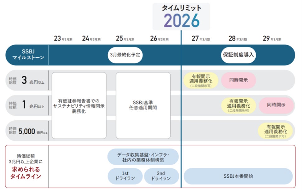 また、サステナビリティ経営へのシフトが国際的な潮流となる中で、サステナビリティ情報の開示制度を整備する動きが加速しており、サステナビリティ情報の国際的な開示基準を策定する機関(ISSB)が2023年6月に国際開示基準を公表し2024年1月に発効されました。一方、日本のサステナビリティ基準委員会(SSBJ)は、日本版基準の策定を進め有価証券報告書での情報開示を義務化させる方向で検討を進めています。本基準は、2027年3月期より東証プライム市場上場の時価総額3兆円以上の企業から適用および財務情報との同時開示が義務付けられ、28年3月期より時価総額1兆円以上、29年3月期より時価総額5000億~1兆円、2030年以降は東証プライム市場上場の全ての企業に適用される見込みです。